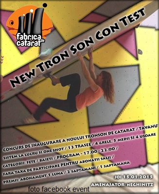 În data de 15 ianuarie 2015, ora 17.00, Fabrica de Căţărat vă invită la inaugurarea noului tronson al sălii! Vă aşteaptă trasee interesante şi o inclinaţie cum nu aţi avut până acum în sală!