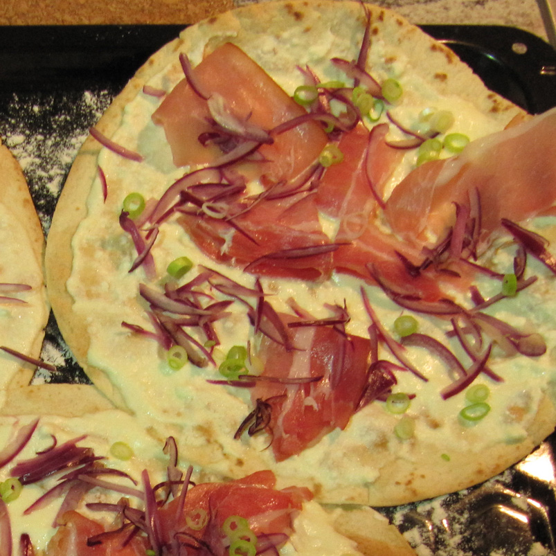 Flammkuchen – “tarte flambée” la francofoni – este verișoară bună cu pizza, i-am putea spune lejer “pizza nemțească”. Exemplarele noastre sunt niște rude mai sărace și mai îndepărtate – am folosit tortillas, adică lipii din îndepărtatul Mexic, dar făcute de turci și cumpărate de la supermarketul din colț. Lipiile libaneze nu se potrivesc aici, indiferent cine le-ar fi făcut. În lipsă de lipii, puteți folosi clătite autohtone. E adevărat, au altă textură și alt gust, dar își îndeplinesc cu succes rolul de suport de ingrediente.