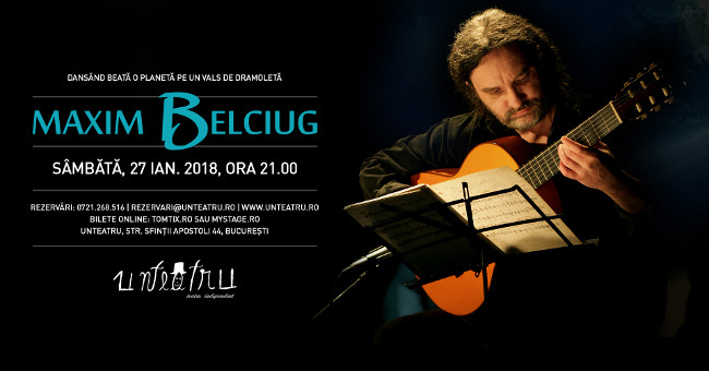 Maxim Belciug vă așteaptă sâmbătă, 27 ianuarie 2018, începând cu ora 21:00, la Unteatru. Un recital de chitară solo, cu un titlu neobișnuit și un chitarist de o sinceritate totală, Dansând beată o planetă pe un dans de dramoletă se anunță un moment cu o sonoritate specială.