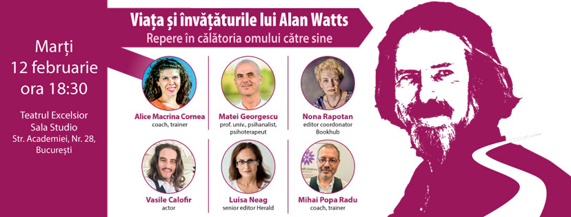Evenimentul Viata si învăţăturile lui Alan Watts – repere în călătoria omului către sine vă propune să-l descoperiți pe Alan Watts prin prisma prelegerilor sale. Un scurtmetraj inspirat din înregistrările acestora și o dezbarete pe tema relevanței operei sale vor umple seara. Au răspuns prezent Mihai Popa Radu (coach, trainer, fondator al Mindfulness Institute), Alice Macrina Cornea (coach, trainer, lector la Fundaţia Calea Victoriei), Matei Georgescu (profesor universitar, psihoterapeut) și actorul Vasile Calofir.