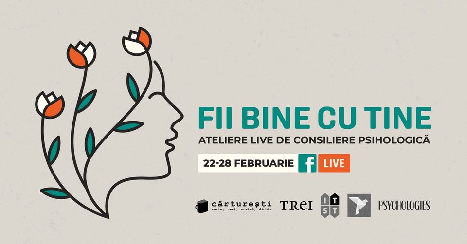 Cărturești revine și în această primăvară cu atelierele dedicate consilierii psihologice, chiar dacă de data aceasta sunt on-line. Sub denumirea Fii bine cu tine, între 23 și 26 februarie 2021, pe conturile Facebook ale organizatorilor (Institutul pentru Studiul și Tratamentul Traumei – ISTT, Editura Trei și Librăriile Cărturești) și ale partenerului media (revista Psychologies) vor avea loc webinarii găzduite de psihoterapeuți cu experiență.