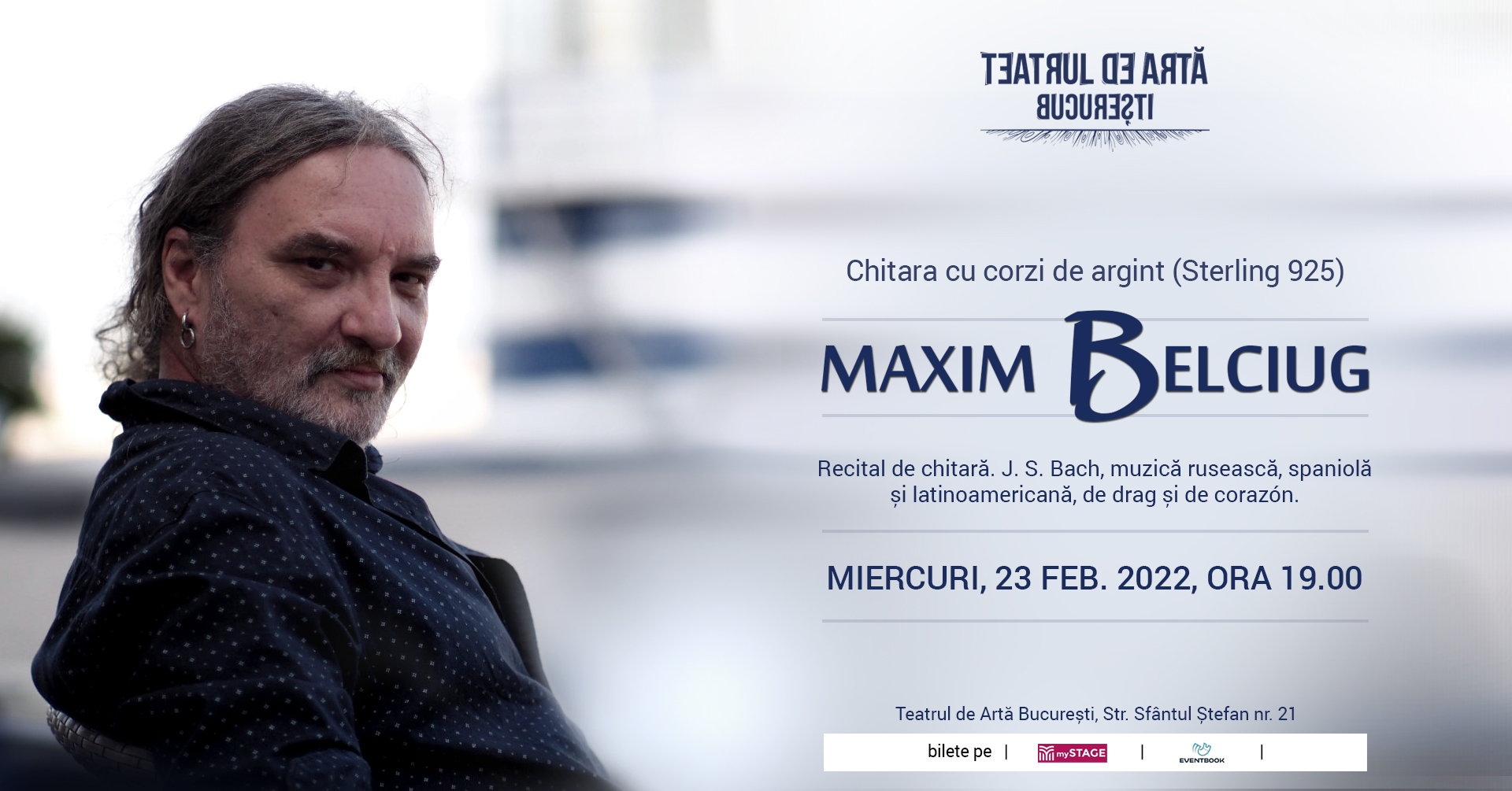 Teatrul de Artă București vă invită miercuri, 23 februarie 2022, la un recital de chitară susținut de Maxim Belciug. Vi se pregătește o seară specială, cu muzică de J. S. Bach, muzică rusească, spaniolă și latino-americană, muzică de drag și de corazón.